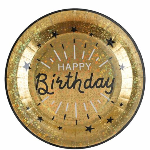 These holographic gold-printed plates are perfect for all ages. The disposable plates are printed with Happy Birthday in the centre. The Sparkling Gold Happy Birthday Paper Plates are standard size, 23cm across. The paper plates are brilliant for a buffet table for snacks & desserts. The Sparkling Gold Happy Birthday Paper Plates are sold in sealed packs of 10.