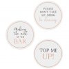 - Printed with ‘Please don’t take my drink’, ‘I’m dancing’, ‘Make the most of the bar’, ‘Top me up’