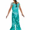 Pretty Disney Princess Jumpsuit. The Disney Jasmine dressing up costume is perfect for any Jasmine fan. The Official Disney Princess costume is a pretty green satin jumpsuit with a detailed bodice. The trousers are a billowing style. The bodice has a Jasmine cameo in the centre.
