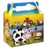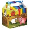 Farm Party Box, Farm animal printed party boxes in assorted designs, a selection will be sent with your order. 12cm high x 10cm wide x 14cm. Sold individually. Great for party treats to take hone or serving a birthday snack at your party. Sufficient room to add a carton of juice, sandwiches, crisps & a treat.