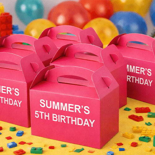 Fuchsia Pink-coloured boxes are ready to add food or treats for your party or event guests. If you are planning a birthday party or a celebration, these are the perfect boxes. Add personalisation to the box on the side. The integrated handles make them super easy to transport to your party venue. Party food boxes are perfect for controlling food portions or to help you consider allergies or dietary requirements at birthday parties. The boxes are about the size of a restaurant that offers happy meals, so there is plenty of room for sandwiches, packets of crisps, fruit and a treat.