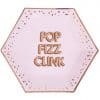 These Glitz & Glamour ‘Pop Fizz Clink’ Paper Plates are sold in packs of 8. Soft pastel pink with a rose gold print of ‘Pop Fizz Clink’. The Glitz & Glamour ‘Pop Fizz Clink’ Paper Plates are 27cm across and a hexagonal shape. Perfect for a 18th birthday party celebration buffet table.