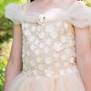 This Golden Princess Child Costume is a beautiful delicate pale gold. The Golden Princess Child Costume has a beautiful velour bodice, delicately covered in cream roses. The long skirt is given a stunning definition with lots of netting, and rose decorations to match the bodice. There are velour straps with off the shoulder sleeves. This beautiful Golden Princess Costume is designed by Travis and is very elegant. The Golden Princess Child Costume also includes a floral headband to wear. The golden princess costume would make a wonderful present, great for dressing up days and school plays. The costume could be washed on a low 40 degree gentle cycle if required.