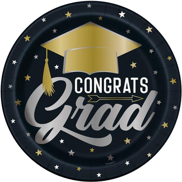 These black paper plates are decorated with gold & silver stars. The Graduation plates feature a gold mortar board at the top. The text reads CONGRATS Grad in a modern text. The graduation plates are disposable, perfect for an afternoon of celebration. The standard size plates are 23cm across, with plenty of room for buffet food or dessert., The plates are sold in sealed packs of 8.