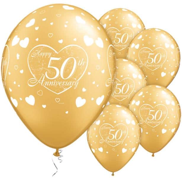 This pack of 6 Little Hearts 50th Anniversary Balloons are printed with Happy 50th Anniversary. Use helium to float – the Little Hearts 50th Anniversary Balloons will inflate to 11″. Can be also filled with air and hung at your party.