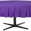 This Purple Party Plastic Round Tablecover is 2.1m across so ideal for a standard 5 foot round table you find in most party venues. The Purple Party Plastic Round Tablecover will have a small overhang around the edges.