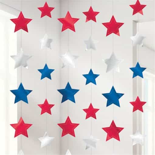 Decorate your party walls and ceilings with these Red, Silver & Blue Star Hanging String Decorations, 2.1m long/ Sold in packs of 6.