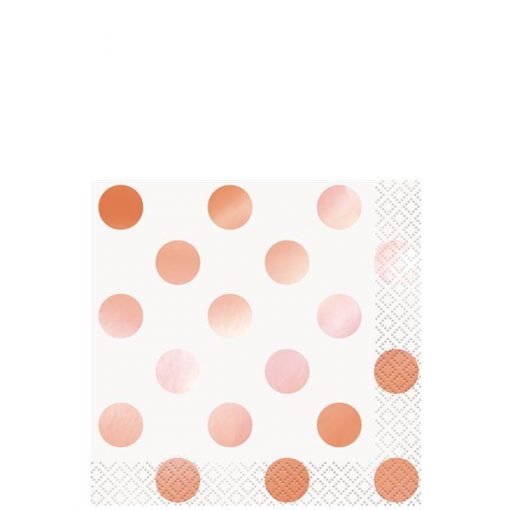 Contemporary Rose Gold Dot Beverage Napkin – beverage size so 25cm x 25cm once fully opened. The Rose Gold Stripe Lunch Napkins are 2 ply and perfect for adult or childrens parties or events. Rose Gold is the on trend colour this party season that looks wonderful for birthdays, wedding, baby showers & more. We have a full range of Rose Gold partyware available.