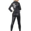 This Sandy Adult Costume is perfect for a Grease themed party or event. The Sandy Adult Costume has 4 pieces. The costume includes an off the shoulder black top with elasticated shoulders. The wet look black leggings also have an elasticated waist. The costume includes a elasticated belt with a clasp fastenings. The Black leather look biker style jacket has a Grease applique to the lapel with a T Bird print on the back. The jacket has a zip fastening.