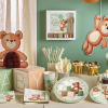 - Features a cute teddy bear sitting on building blocks, surrounded by mint green, duck egg blue, and neutral shades of creams and taupe